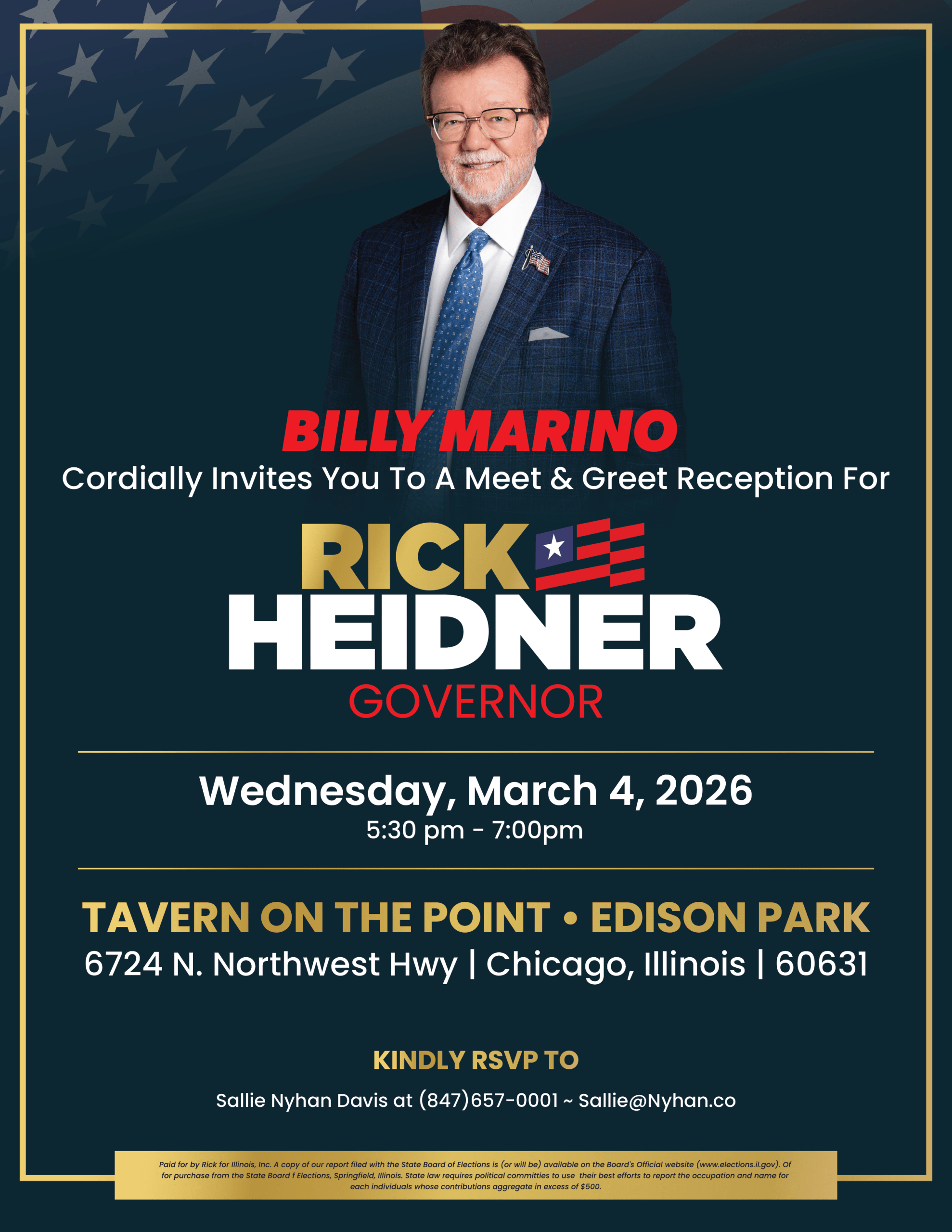 Tavern on the Point in Edison Park will host a special Meet & Greet Reception with Rick Heidner for Governor on Wednesday, March 4, 2026 from 5:30PM–7:00PM.